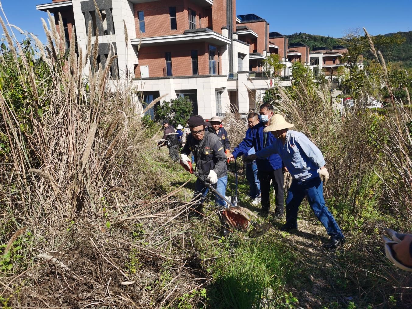 當(dāng)天大家頂著炎炎烈日,戴著手套,拿著工具對水池周圍一米范圍內(nèi)的灌木、雜草,樹木進行修枝清理和清除消防泵房周圍一米范圍內(nèi)雜草。除草區(qū)域分片區(qū)迅速展開除草行動,有的拿鐮刀割、有的拿鋤頭刨、有的用割草機割、有的拿砍刀砍,還有的直接用手,全然不顧泥草沾滿了褲腿,大家興致高昂、分工合作、積極配合,充分發(fā)揮了不怕苦、不怕臟、不怕累的勞動精神,通過三小時的清理原本雜草叢生的水池便煥然一新,回望路邊一個又一個的草垛,大家都露出了開心的笑容。