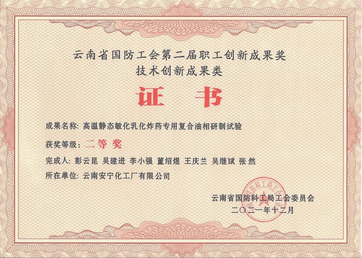 公司開展的研發(fā)項目《高溫靜態(tài)敏化乳化炸藥專用復(fù)合油相研制試驗》在經(jīng)過申報考核后獲得云南省國防工會第二屆職工創(chuàng)新成果獎技術(shù)創(chuàng)新成果類二等獎。