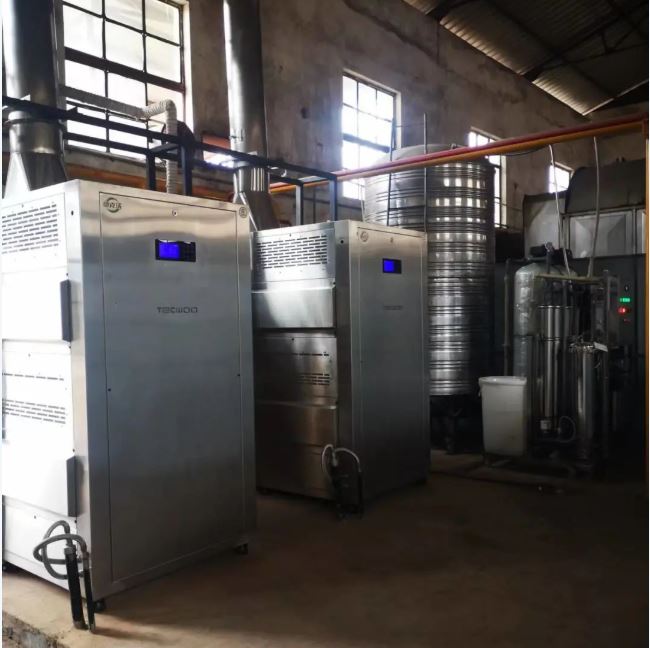 1.水變清了。燃煤鍋爐和烘干爐使用時(shí)排出的廢水含有煤渣、硫磺等物質(zhì)又黑又臭,需要經(jīng)過(guò)沉淀脫硫處理才能用于綠化。使用天然氣以后蒸汽熱源機(jī)采用純水機(jī)制備純水供給蒸汽熱源機(jī)使用,廢水為純水機(jī)工作產(chǎn)生的濃縮水,不需要任何處理直接可以用于綠化。原來(lái)收集鍋爐和烘干爐廢水的收集池由黑水池、臭水池變成了長(zhǎng)滿青苔和水草的綠色水池。