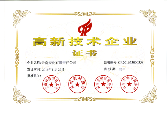 2016年11月29日,根據(jù)《高新技術(shù)企業(yè)認定管理辦法》(國科發(fā)火〔2016〕32號)和《高新技術(shù)企業(yè)認定管理工作指引》(國科發(fā)火〔2016〕195號)的規(guī)定,經(jīng)州(市)科技、財政、國稅、地稅部門審查推薦,云南省環(huán)保、質(zhì)監(jiān)、安監(jiān)等部門確認,認定云南安化有限責任公司前一年內(nèi)未發(fā)生重大安全、重大質(zhì)量事故或嚴重環(huán)境違法行為,經(jīng)云南省高新技術(shù)企業(yè)認定管理工作領(lǐng)導小組辦公室進行形式審查、組織專家評審、聯(lián)合審定等程序,認定云南安化有限責任公司為國家高新技術(shù)企業(yè),有效期三年。